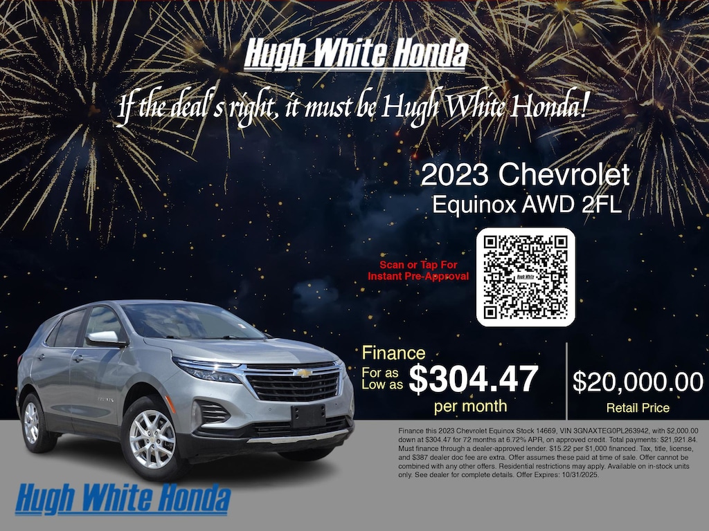 The Hugh White Honda used car dealership in Central Ohio is an easy drive or fly in from anywhere in the United States. Your 2023 Chevrolet Equinox AWD 2FL will be waiting for your test drive and/or shipping instructions.