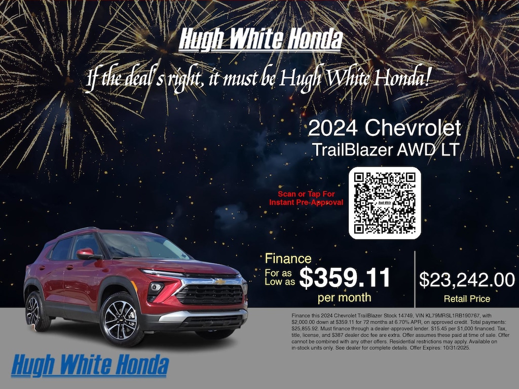 The Hugh White Honda used car dealership in Central Ohio is an easy drive or fly in from anywhere in the United States. Your 2024 Chevrolet TrailBlazer AWD LT will be waiting for your test drive and/or shipping instructions.