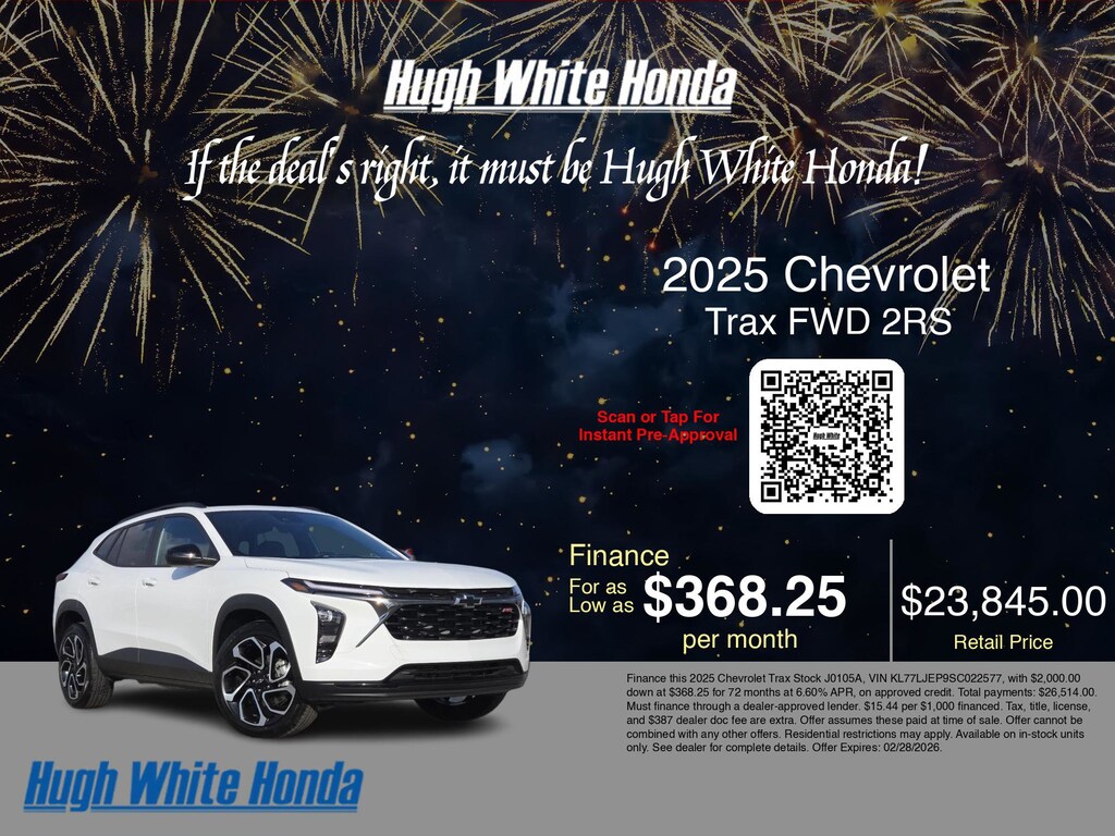 The Hugh White Honda used car dealership in Central Ohio is an easy drive or fly in from anywhere in the United States. Your 2025 Chevrolet Trax FWD 2RS will be waiting for your test drive and/or shipping instructions.