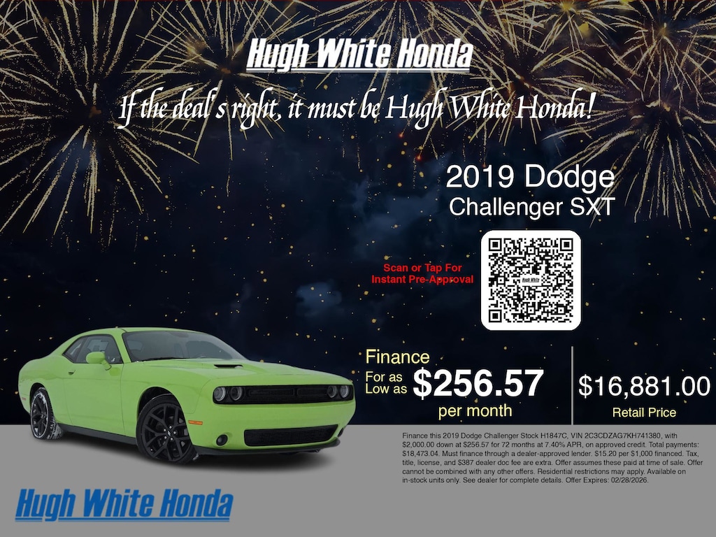 If you're ready to finance a used Honda vehicle near Columbus, Grove City, Hilliard, and Canal Winchester, Hugh White Honda is thrilled to offer you a competitive finance offer on this 2019 Dodge Challenger SXT. Use our car payment calculator to estimate your monthly payments or see how the monthly payment of $256.57 is calculated for well-qualified buyers shopping at Hugh White Honda with Tier 1 credit: