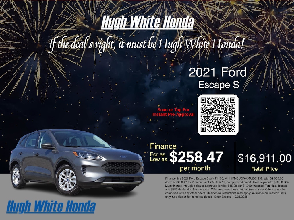 If you're ready to finance a used Honda vehicle near Columbus, Grove City, Hilliard, and Canal Winchester, Hugh White Honda is thrilled to offer you a competitive finance offer on this 2021 Ford Escape S. Use our car payment calculator to estimate your monthly payments or see how the monthly payment of $258.47 is calculated for well-qualified buyers shopping at Hugh White Honda with Tier 1 credit: