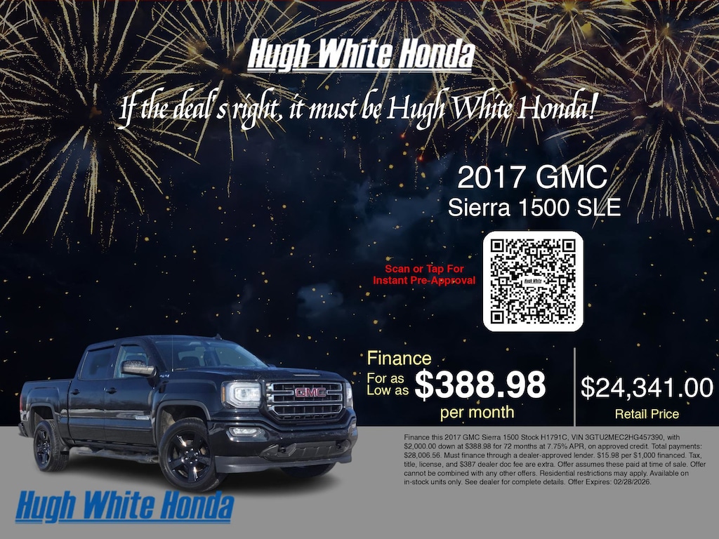 If you're ready to finance a used Honda vehicle near Columbus, Grove City, Hilliard, and Canal Winchester, Hugh White Honda is thrilled to offer you a competitive finance offer on this 2017 GMC Sierra 1500 SLE. Use our car payment calculator to estimate your monthly payments or see how the monthly payment of $388.98 is calculated for well-qualified buyers shopping at Hugh White Honda with Tier 1 credit: