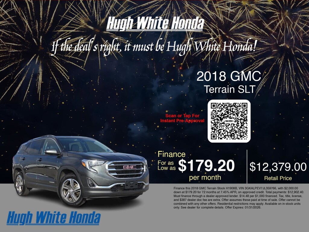 If you're ready to finance a used Honda vehicle near Columbus, Grove City, Hilliard, and Canal Winchester, Hugh White Honda is thrilled to offer you a competitive finance offer on this 2018 GMC Terrain SLT. Use our car payment calculator to estimate your monthly payments or see how the monthly payment of $179.20 is calculated for well-qualified buyers shopping at Hugh White Honda with Tier 1 credit: