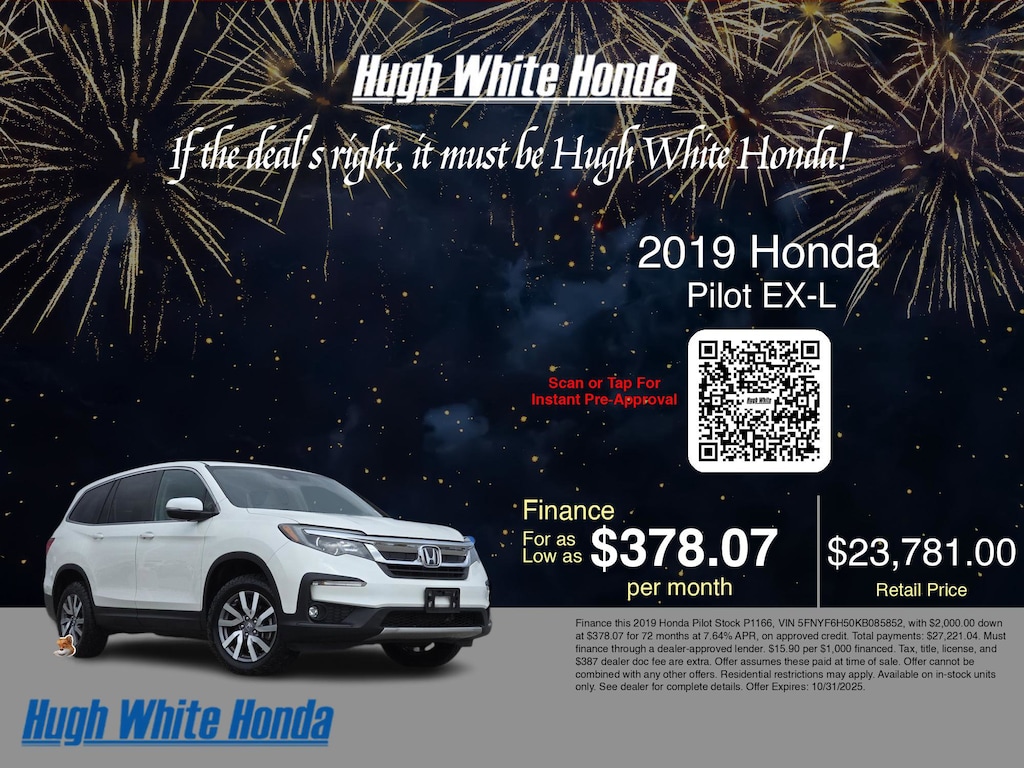 If you're ready to finance a used Honda vehicle near Columbus, Grove City, Hilliard, and Canal Winchester, Hugh White Honda is thrilled to offer you a competitive finance offer on this 2019 Honda Pilot EX-L. Use our car payment calculator to estimate your monthly payments or see how the monthly payment of $378.07 is calculated for well-qualified buyers shopping at Hugh White Honda with Tier 1 credit: