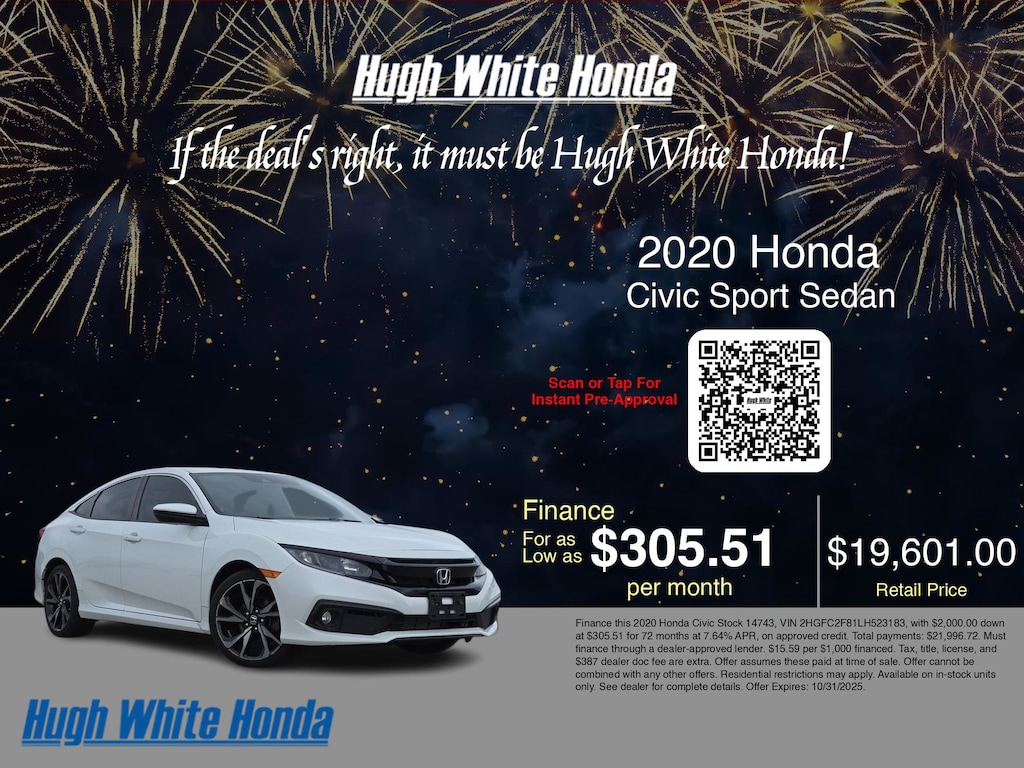 If you're ready to finance a used Honda vehicle near Columbus, Grove City, Hilliard, and Canal Winchester, Hugh White Honda is thrilled to offer you a competitive finance offer on this 2020 Honda Civic Sport Sedan. Use our car payment calculator to estimate your monthly payments or see how the monthly payment of $305.51 is calculated for well-qualified buyers shopping at Hugh White Honda with Tier 1 credit: