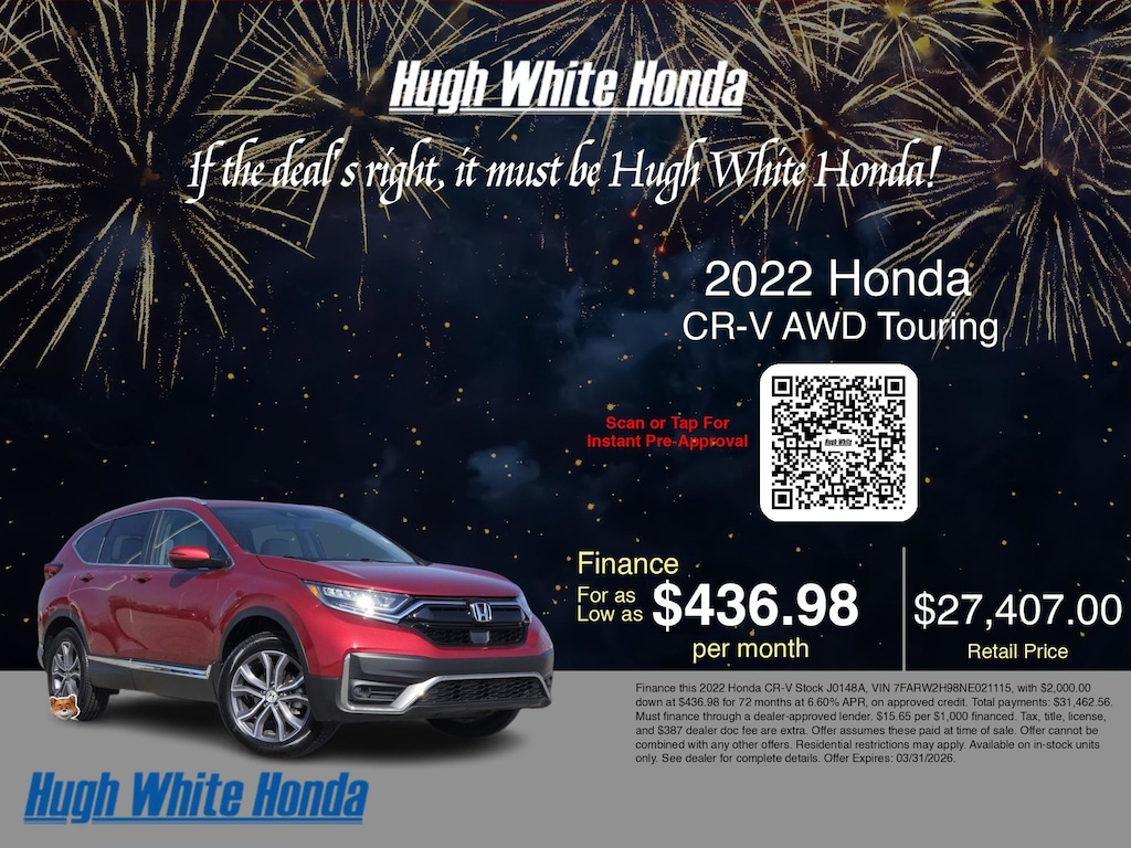 If you're ready to finance a used Honda vehicle near Columbus, Grove City, Hilliard, and Canal Winchester, Hugh White Honda is thrilled to offer you a competitive finance offer on this 2022 Honda CR-V AWD Touring. Use our car payment calculator to estimate your monthly payments or see how the monthly payment of $436.98 is calculated for well-qualified buyers shopping at Hugh White Honda with Tier 1 credit: