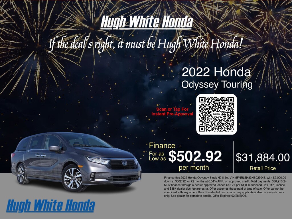 If you're ready to finance a used Honda vehicle near Columbus, Grove City, Hilliard, and Canal Winchester, Hugh White Honda is thrilled to offer you a competitive finance offer on this 2022 Honda Odyssey Touring. Use our car payment calculator to estimate your monthly payments or see how the monthly payment of $502.92 is calculated for well-qualified buyers shopping at Hugh White Honda with Tier 1 credit: