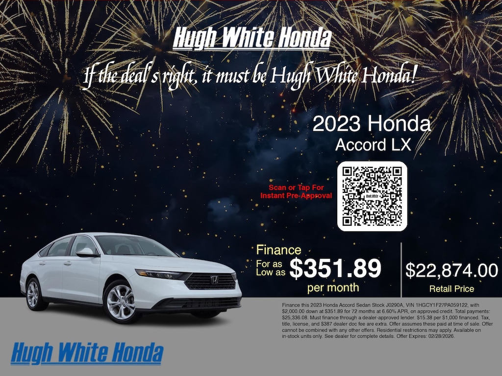 If you're ready to finance a used Honda vehicle near Columbus, Grove City, Hilliard, and Canal Winchester, Hugh White Honda is thrilled to offer you a competitive finance offer on this 2023 Honda Accord LX. Use our car payment calculator to estimate your monthly payments or see how the monthly payment of $351.89 is calculated for well-qualified buyers shopping at Hugh White Honda with Tier 1 credit: