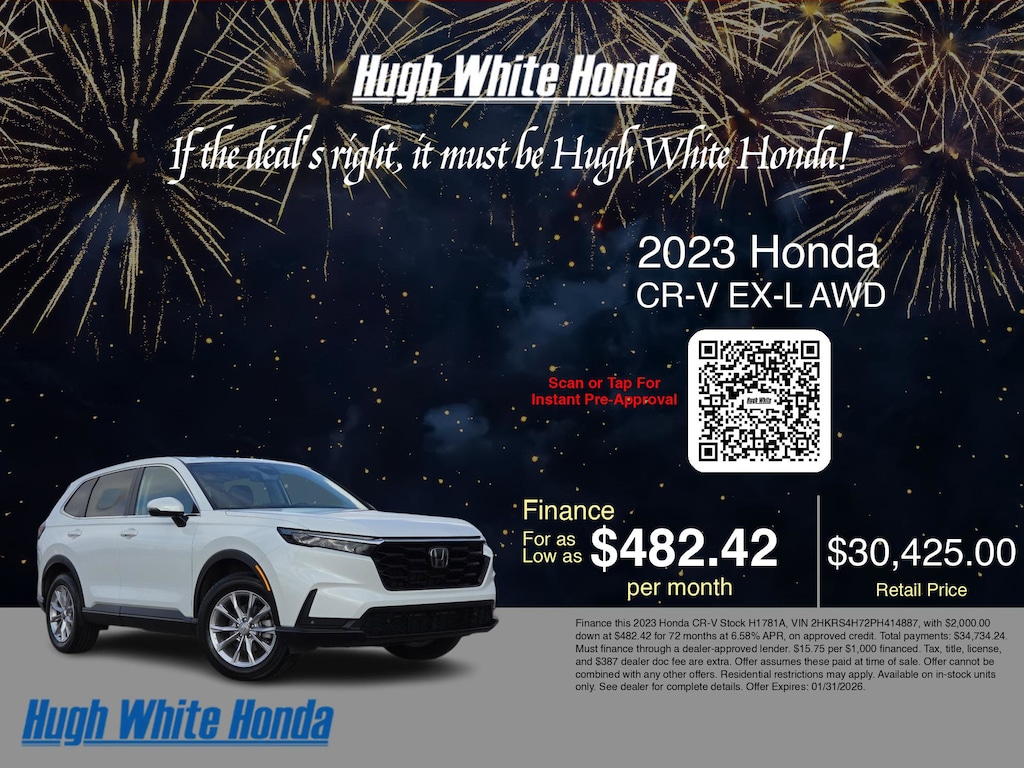 Disclaimer: Finance this 2023 Honda CR-V Stock H1781A, VIN 2HKRS4H72PH414887, with $2,000.00 down at $482.42 for 72 months at 6.58% APR, on approved credit. Total payments: $34,734.24. Must finance through a dealer-approved lender. $15.75 per $1,000 financed. Tax, title, license, and $387 dealer doc fee are extra. Offer assumes these paid at time of sale. Offer cannot be combined with any other offers. Residential restrictions may apply. Available on in-stock units only. See dealer for complete details. Offer Expires: 01/31/2026.