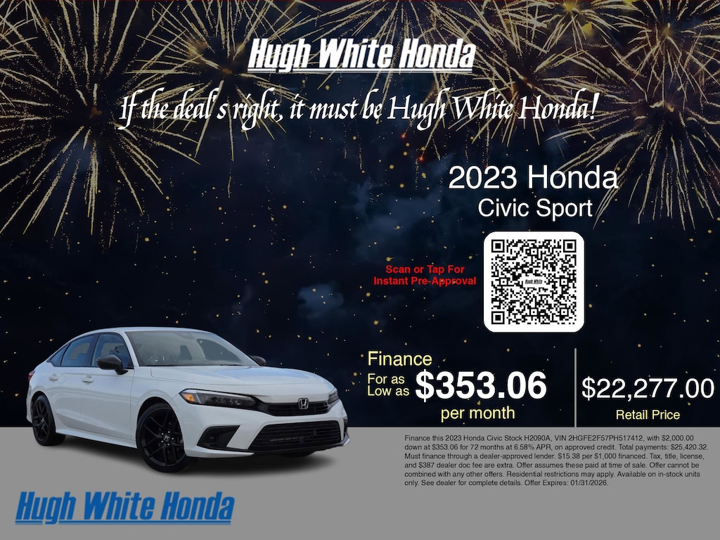 If you're ready to finance a used Honda vehicle near Columbus, Grove City, Hilliard, and Canal Winchester, Hugh White Honda is thrilled to offer you a competitive finance offer on this 2023 Honda Civic Sport. Use our car payment calculator to estimate your monthly payments or see how the monthly payment of $353.06 is calculated for well-qualified buyers shopping at Hugh White Honda with Tier 1 credit: