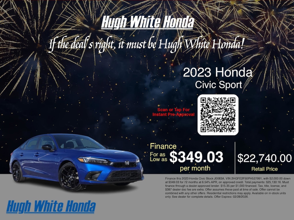 If you're ready to finance a used Honda vehicle near Columbus, Grove City, Hilliard, and Canal Winchester, Hugh White Honda is thrilled to offer you a competitive finance offer on this 2023 Honda Civic Sport. Use our car payment calculator to estimate your monthly payments or see how the monthly payment of $349.03 is calculated for well-qualified buyers shopping at Hugh White Honda with Tier 1 credit: