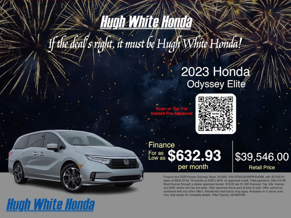 If you're ready to finance a used Honda vehicle near Columbus, Grove City, Hilliard, and Canal Winchester, Hugh White Honda is thrilled to offer you a competitive finance offer on this 2023 Honda Odyssey Elite. Use our car payment calculator to estimate your monthly payments or see how the monthly payment of $632.93 is calculated for well-qualified buyers shopping at Hugh White Honda with Tier 1 credit: