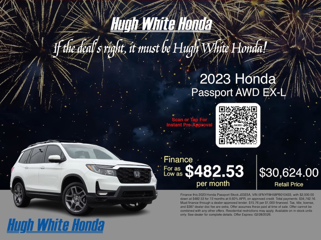 Disclaimer: Finance this 2023 Honda Passport Stock J0323A, VIN 5FNYF8H58PB010433, with $2,000.00 down at $482.53 for 72 months at 6.60% APR, on approved credit. Total payments: $34,742.16. Must finance through a dealer-approved lender. $15.76 per $1,000 financed. Tax, title, license, and $387 dealer doc fee are extra. Offer assumes these paid at time of sale. Offer cannot be combined with any other offers. Residential restrictions may apply. Available on in-stock units only. See dealer for complete details. Offer Expires: 02/28/2026.
