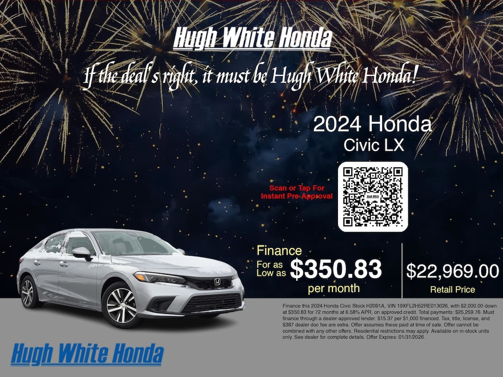 If you're ready to finance a used Honda vehicle near Columbus, Grove City, Hilliard, and Canal Winchester, Hugh White Honda is thrilled to offer you a competitive finance offer on this 2024 Honda Civic LX. Use our car payment calculator to estimate your monthly payments or see how the monthly payment of $350.83 is calculated for well-qualified buyers shopping at Hugh White Honda with Tier 1 credit: