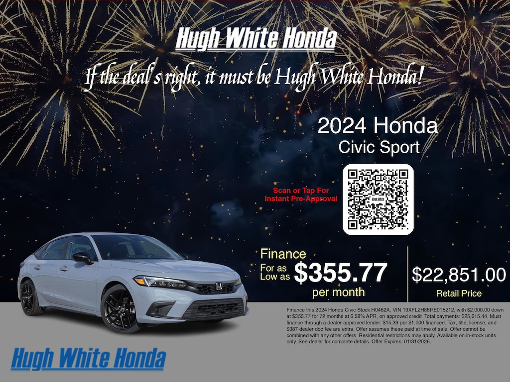 Disclaimer: Finance this 2024 Honda Civic Stock H0462A, VIN 19XFL2H86RE015212, with $2,000.00 down at $355.77 for 72 months at 6.58% APR, on approved credit. Total payments: $25,615.44. Must finance through a dealer-approved lender. $15.39 per $1,000 financed. Tax, title, license, and $387 dealer doc fee are extra. Offer assumes these paid at time of sale. Offer cannot be combined with any other offers. Residential restrictions may apply. Available on in-stock units only. See dealer for complete details. Offer Expires: 01/31/2026.
