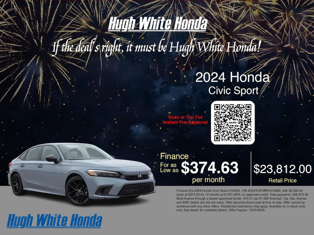 Disclaimer: Finance this 2024 Honda Civic Stock H1635A, VIN 2HGFE2F58RH514280, with $2,000.00 down at $374.63 for 72 months at 6.70% APR, on approved credit. Total payments: $26,973.36. Must finance through a dealer-approved lender. $15.51 per $1,000 financed. Tax, title, license, and $387 dealer doc fee are extra. Offer assumes these paid at time of sale. Offer cannot be combined with any other offers. Residential restrictions may apply. Available on in-stock units only. See dealer for complete details. Offer Expires: 12/31/2025.