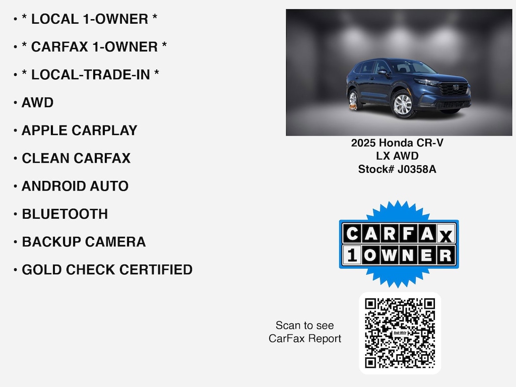 This 2025 Honda CR-V for sale includes a Limited Warranty, Dealer pays 100% labor, 100% parts. ENGINE: Engine block and cylinderheads and all internally lubricated parts; timing gears and timing chain or belt; intake manifold and exhaust manifolds; water pump; fuel pump; thermostat; seals and gaskets. for 3 months or 3,000 miles of Powertrain Coverage, TRANSMISSION/ TRANSAXLE: Transmission/ Transaxle case and all internally lubricated parts; torque converter; pressure regulator valve; pressure switches; solenoids; yoke; extension housing; speedometer drive gears; shift cover and forks; separate bell housing; seals and gaskets.1111111111111111111111111111111111111111111111111111111111111111111111. DRIVE AXLE: Differential/ axle housing(s) and all internally lubricated parts; cover; transfer case and all internal parts; seals and gaskets.. Gold Check Certified 3 months or 3000 miles Powertrain Warranty, whichever comes first. for your peace of mind!