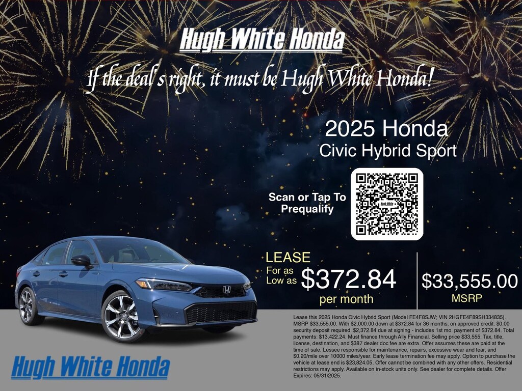 Disclaimer: Lease this 2025 Honda Civic Hybrid Sport (Model FE4F8SJW; VIN 2HGFE4F89SH334835). MSRP $33,555.00. With $2,000.00 down at $372.84 for 36 months, on approved credit. $0.00 security deposit required. $2,372.84 due at signing - includes 1st mo. payment of $372.84. Total payments: $13,422.24. Must finance through Ally Financial. Selling price $33,555. Tax, title, license, destination, and $387 dealer doc fee are extra. Offer assumes these are paid at the time of sale. Lessee responsible for maintenance, repairs, excessive wear and tear, and $0.20/mile over 10000 miles/year. Early lease termination fee may apply. Option to purchase the vehicle at lease end is $23,824.05. Offer cannot be combined with any other offers. Residential restrictions may apply. Available on in-stock units only. See dealer for complete details. Offer Expires: 05/31/2025.