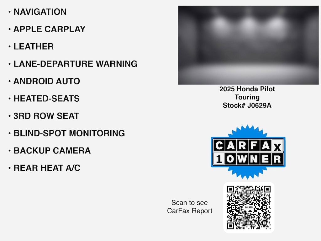 DESIRABLE FEATURES: APPLE CARPLAY, NAVIGATION, LEATHER, HEATED-SEATS, LANE-DEPARTURE WARNING, ANDROID AUTO, 3RD ROW SEAT, BLUETOOTH, POWER LIFT-GATE, BLIND-SPOT MONITORING, BACKUP CAMERA, REAR HEAT A/C, MULTI-ZONE AC, ALLOY-WHEELS, HOMELINK, FOG LAMPS, SiriusXM, Remote entry. Your 2025 Honda Pilot Touring is perfect for daily work or weekend road trips to our neighboring communities of Grove City.