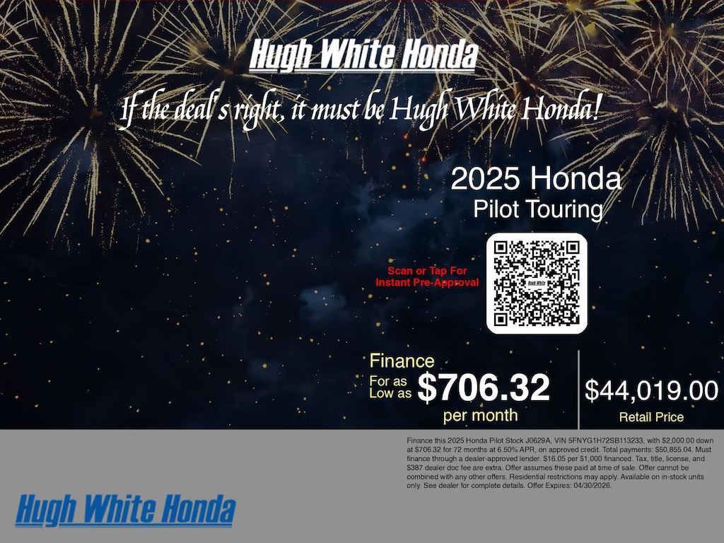 If you're ready to finance a used Honda vehicle near Columbus, Grove City, Hilliard, and Canal Winchester, Hugh White Honda is thrilled to offer you a competitive finance offer on this 2025 Honda Pilot Touring. Use our car payment calculator to estimate your monthly payments or see how the monthly payment of $706.32 is calculated for well-qualified buyers shopping at Hugh White Honda with Tier 1 credit: