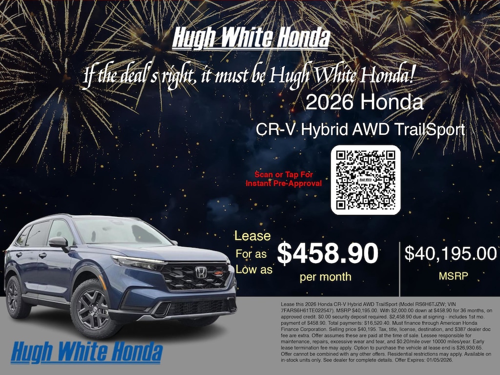 Disclaimer: Lease this 2026 Honda CR-V Hybrid AWD TrailSport (Model RS6H6TJZW; VIN 7FARS6H61TE022547). MSRP $40,195.00. With $2,000.00 down at $458.90 for 36 months, on approved credit. $0.00 security deposit required. $2,458.90 due at signing - includes 1st mo. payment of $458.90. Total payments: $16,520.40. Must finance through American Honda Finance Corporation. Selling price $40,195. Tax, title, license, destination, and $387 dealer doc fee are extra. Offer assumes these are paid at the time of sale. Lessee responsible for maintenance, repairs, excessive wear and tear, and $0.20/mile over 10000 miles/year. Early lease termination fee may apply. Option to purchase the vehicle at lease end is $26,930.65. Offer cannot be combined with any other offers. Residential restrictions may apply. Available on in-stock units only. See dealer for complete details. Offer Expires: 01/05/2026.