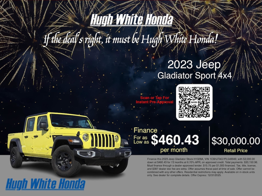 Discover Jeep Gladiator Sport 4x4 Exceptional Savings at Hugh White Honda!