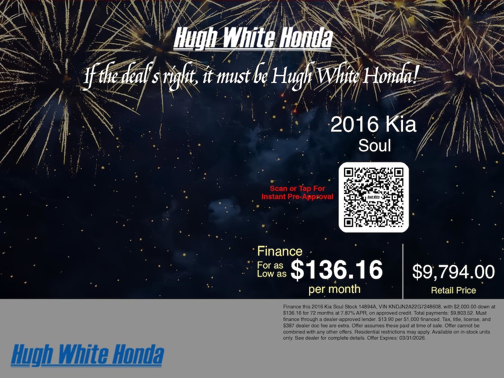 If you're ready to finance a used Honda vehicle near Columbus, Grove City, Hilliard, and Canal Winchester, Hugh White Honda is thrilled to offer you a competitive finance offer on this 2016 Kia Soul . Use our car payment calculator to estimate your monthly payments or see how the monthly payment of $136.16 is calculated for well-qualified buyers shopping at Hugh White Honda with Tier 1 credit: