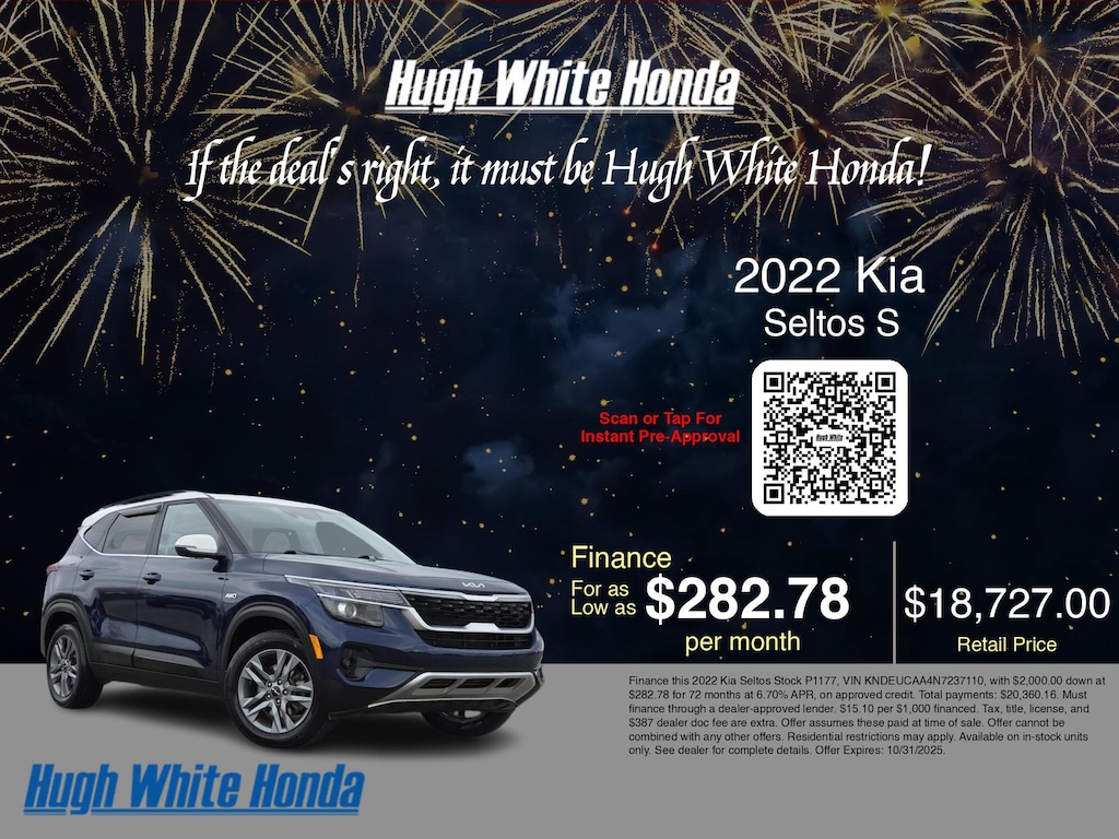If you're ready to finance a used Honda vehicle near Columbus, Grove City, Hilliard, and Canal Winchester, Hugh White Honda is thrilled to offer you a competitive finance offer on this 2022 Kia Seltos S. Use our car payment calculator to estimate your monthly payments or see how the monthly payment of $282.78 is calculated for well-qualified buyers shopping at Hugh White Honda with Tier 1 credit: