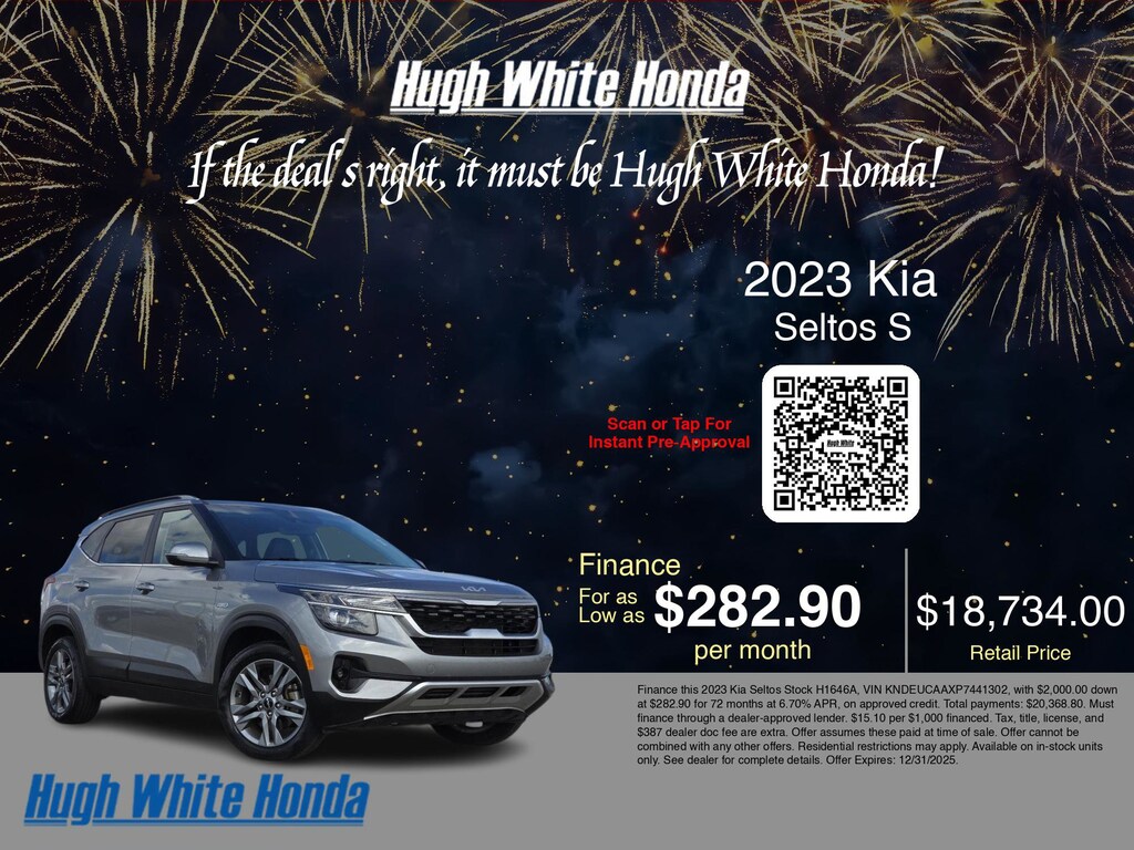 If you're ready to finance a used Honda vehicle near Columbus, Grove City, Hilliard, and Canal Winchester, Hugh White Honda is thrilled to offer you a competitive finance offer on this 2023 Kia Seltos S. Use our car payment calculator to estimate your monthly payments or see how the monthly payment of $282.90 is calculated for well-qualified buyers shopping at Hugh White Honda with Tier 1 credit: