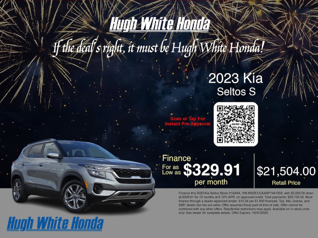 If you're ready to finance a used Honda vehicle near Columbus, Grove City, Hilliard, and Canal Winchester, Hugh White Honda is thrilled to offer you a competitive finance offer on this 2023 Kia Seltos S. Use our car payment calculator to estimate your monthly payments or see how the monthly payment of $329.91 is calculated for well-qualified buyers shopping at Hugh White Honda with Tier 1 credit: