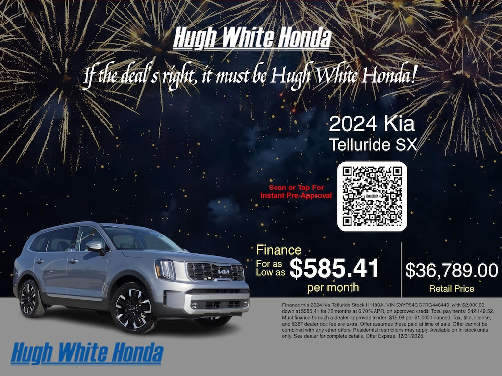 Why utilize Honda Financial Services Financing? You can use our Honda Dealer car payment calculator to calculate your payment on this Silver 2024 Kia Telluride SX. Our Hugh White Honda Honda Financial Services Specialists work with every level of credit and Honda Financing needs. From bad credit car financing to the highest credit scores, our Honda Financial Services experts offer more and better credit options than used car lots in Columbus, OH.