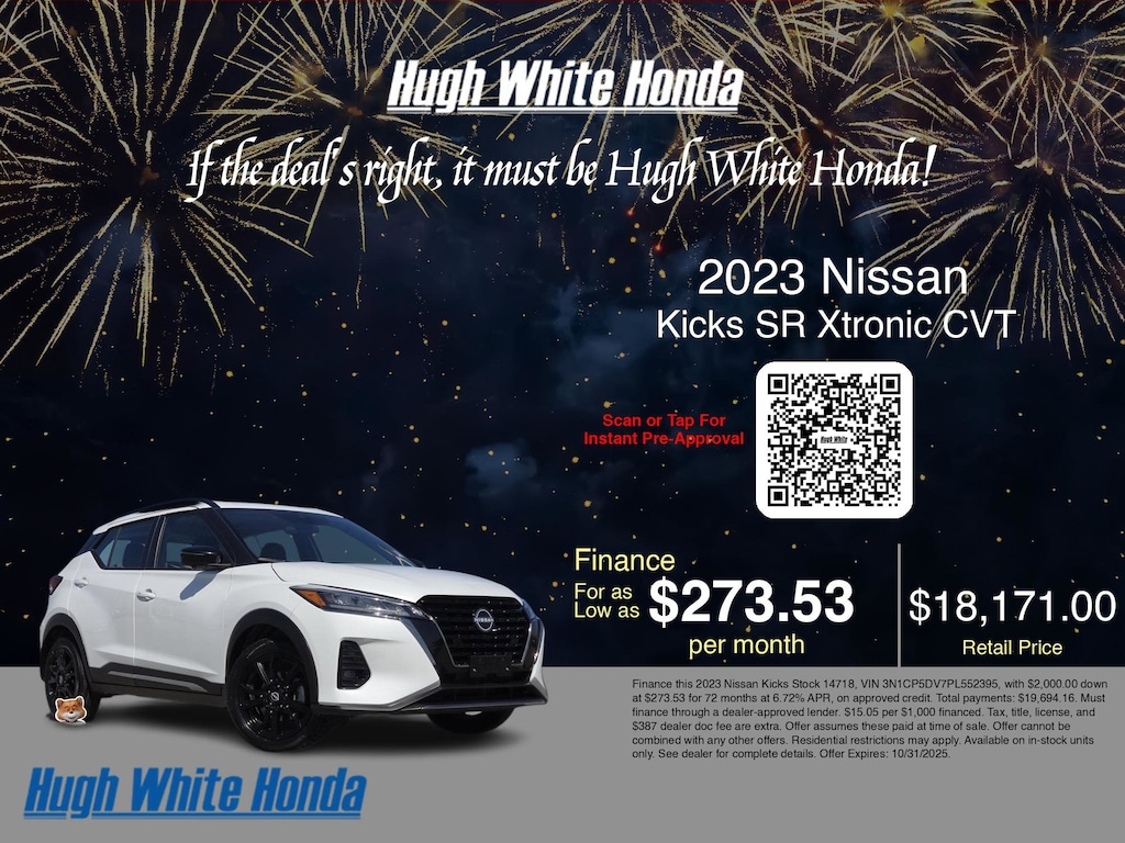 If you're ready to finance a used Honda vehicle near Columbus, Grove City, Hilliard, and Canal Winchester, Hugh White Honda is thrilled to offer you a competitive finance offer on this 2023 Nissan Kicks SR Xtronic CVT. Use our car payment calculator to estimate your monthly payments or see how the monthly payment of $273.53 is calculated for well-qualified buyers shopping at Hugh White Honda with Tier 1 credit: