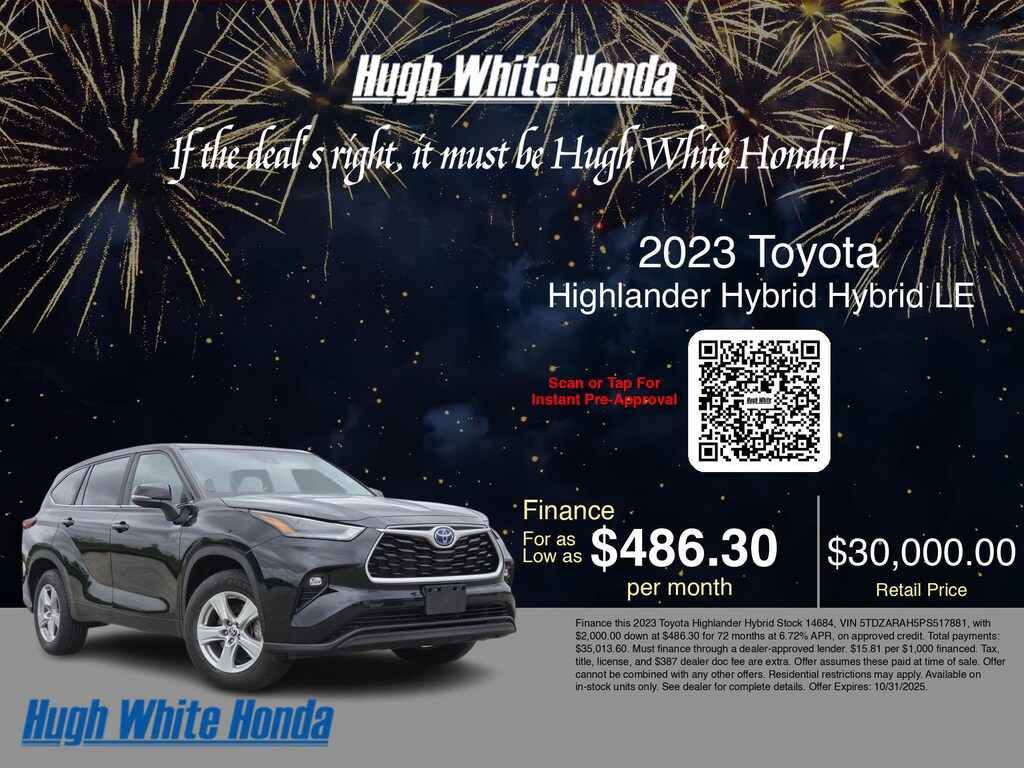 Disclaimer: Finance this 2023 Toyota Highlander Hybrid Stock 14684, VIN 5TDZARAH5PS517881, with $2,000.00 down at $486.30 for 72 months at 6.72% APR, on approved credit. Total payments: $35,013.60. Must finance through a dealer-approved lender. $15.81 per $1,000 financed. Tax, title, license, and $387 dealer doc fee are extra. Offer assumes these paid at time of sale. Offer cannot be combined with any other offers. Residential restrictions may apply. Available on in-stock units only. See dealer for complete details. Offer Expires: 10/31/2025.