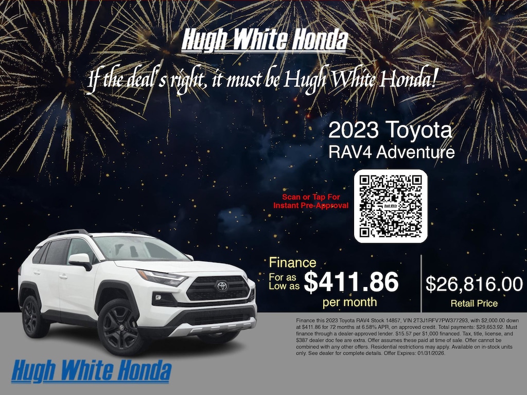 If you're ready to finance a used Honda vehicle near Columbus, Grove City, Hilliard, and Canal Winchester, Hugh White Honda is thrilled to offer you a competitive finance offer on this 2023 Toyota RAV4 Adventure. Use our car payment calculator to estimate your monthly payments or see how the monthly payment of $411.86 is calculated for well-qualified buyers shopping at Hugh White Honda with Tier 1 credit: