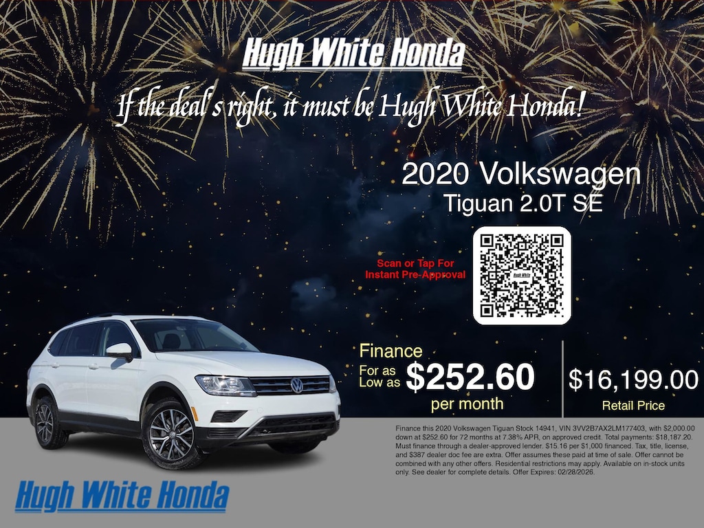 If you're ready to finance a used Honda vehicle near Columbus, Grove City, Hilliard, and Canal Winchester, Hugh White Honda is thrilled to offer you a competitive finance offer on this 2020 Volkswagen Tiguan 2.0T SE. Use our car payment calculator to estimate your monthly payments or see how the monthly payment of $252.60 is calculated for well-qualified buyers shopping at Hugh White Honda with Tier 1 credit: